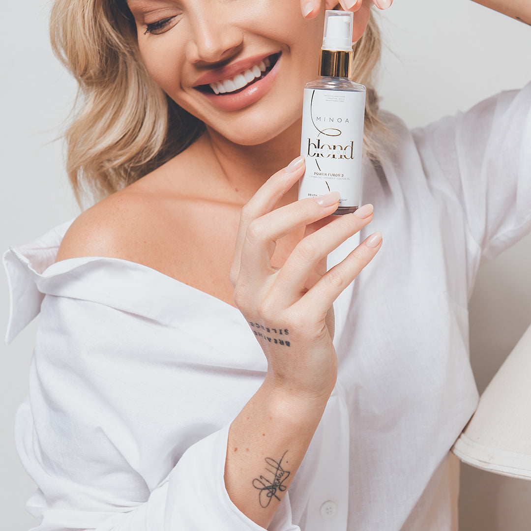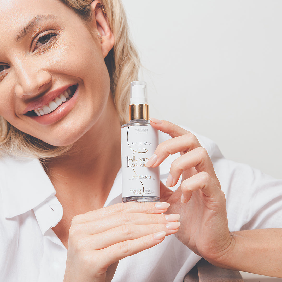 O SERUM REVITALIZADOR BLONDIE POWER FUROR 3 combina ativos preciosos e essenciais como vitamina E, óleo de rícino e copaíba. Auxilia na reparação das pontas duplas e no aspecto ressecados dos fios, proporcionando proteção térmica. Ajuda na redução considerável da quebra das pontas, e reduz o frizz indesejado dos cabelos que passaram por processos químicos.